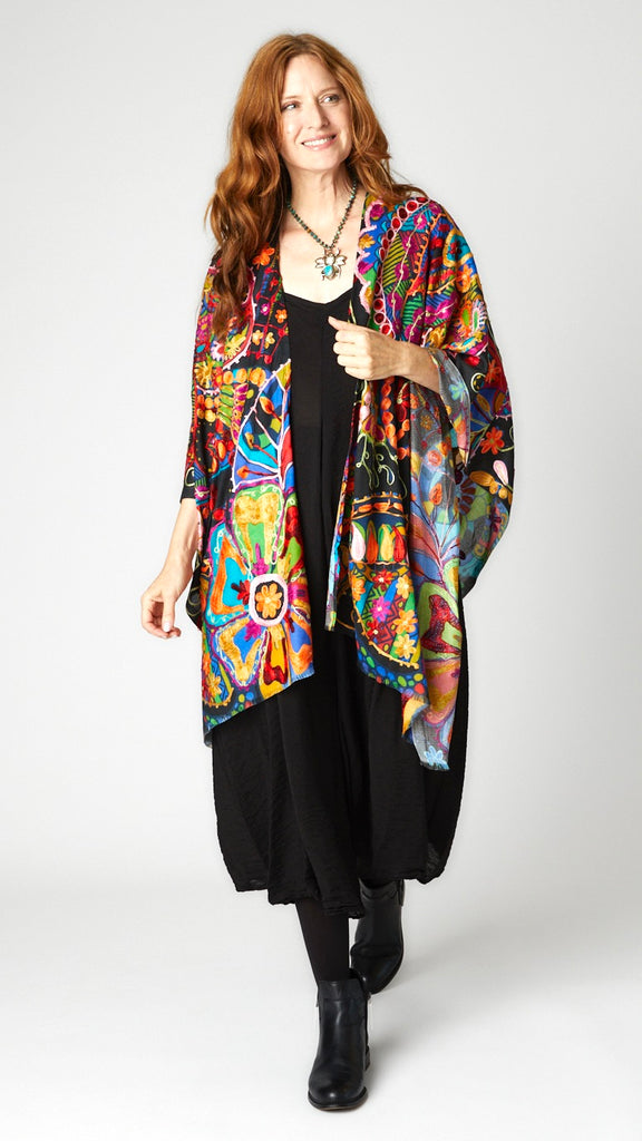 The Lightweight Wool Madrid Ruana is one of our favorite accessories for year-round adornment. Simple black ground makes it an easy add-on over any all black outfit and instantly elevates your look! Richly embroidered in bold color.