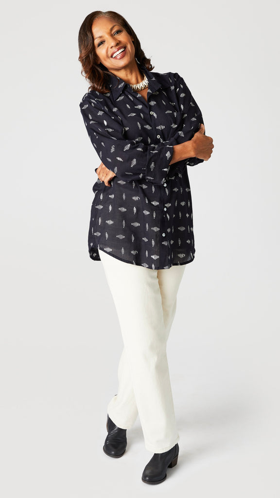 Step into fall with classic ecru, natural denim. High, comfortable waist, long and lean legs, retro button front and incredible comfort. A great alternative to indigo! Looks great with any of our natural hand knit cotton sweaters. Shown here with the Milan V-Neck Sweater.