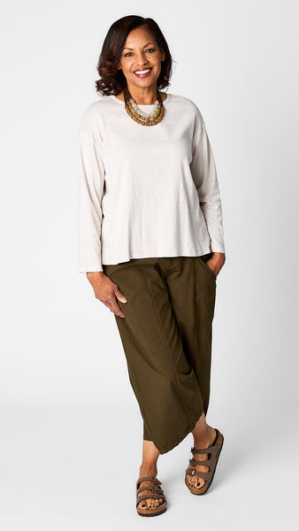 The comfy, versatile One Pocket Pant from Gerties 11 Stitch is the perfect weight in a light tencel cotton blend. Loose, relaxed fit, slightly cropped length, generous pocket and elastic waistline. Pack and travel with this versatile piece! Great for hiking, beach combing and lake weekends! Shown here in Cloud with the Big Shirt from and the Beach Tee in an invisible stripe.