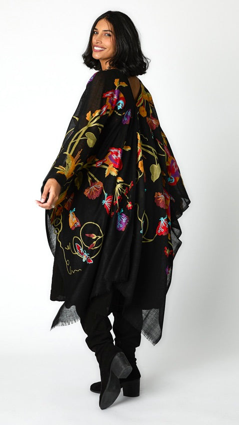 Finely embroidered on lightweight wool, the Botanical Ruana is a work of art. Worn over jeans and a tee, or over your most luxurious pieces, this stunning piece has the power to transform your look and take you anywhere from the most casual gathering, to elegant, once-in-a-lifetime events. Wrap yourself in beauty and tradition. Heirloom quality.