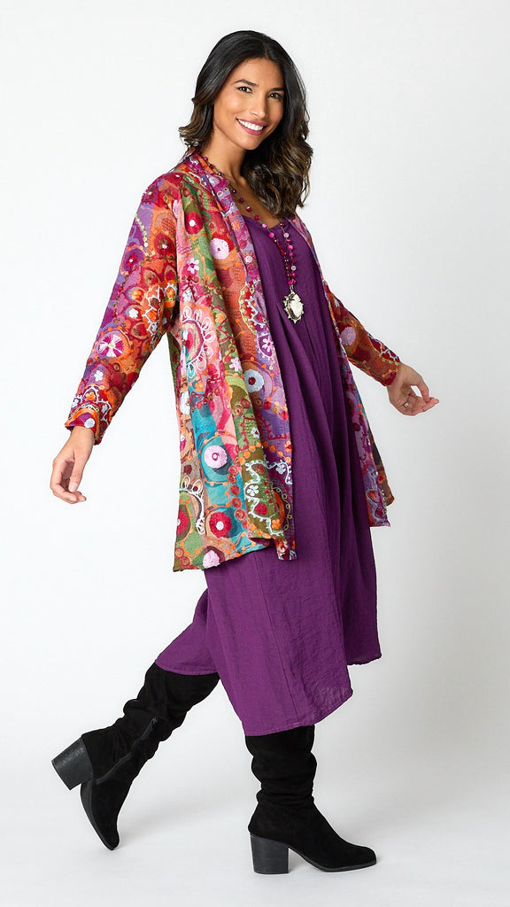 The Corinth Shawl Collared Jacket is one of our most versatile and colorful piece. All over color, heavily embroidered in jewel tones and brights alike! Purples, reds, pinks, greens, blues and oranges….Oh, my!