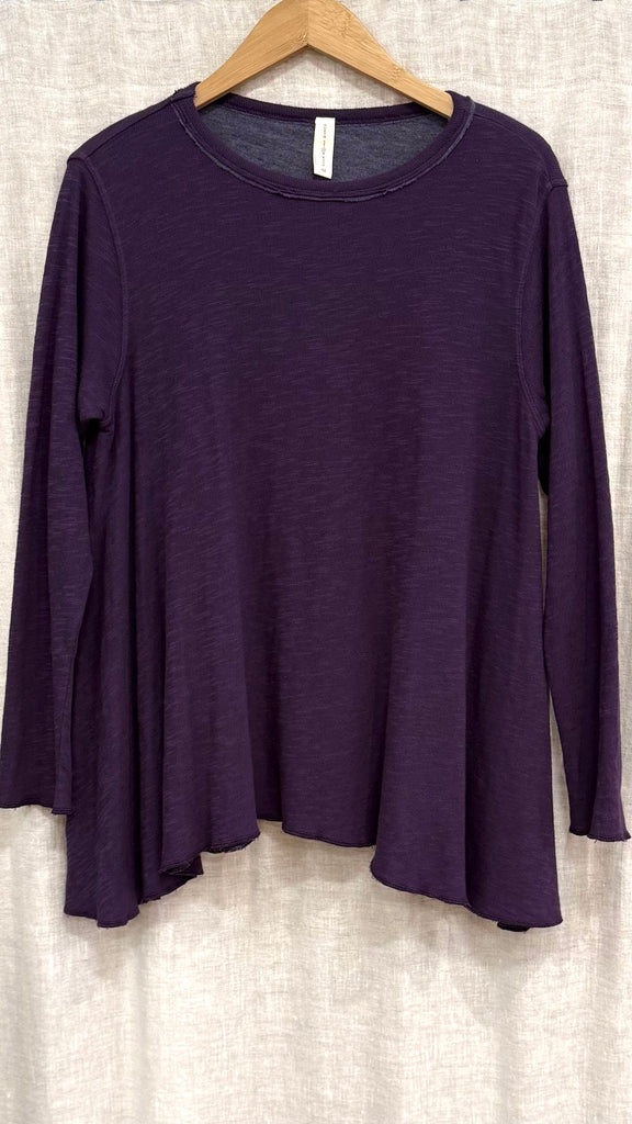 Get comfy in the Long Angel Tee from North Star Base by Gerties. Flattering, hip length flare, soft cotton blend and simple round neck. Generous long sleeves make this a perfect top for mountain and beach evenings on the deck or midnight outings in the boat. Frayed hemline a bit lower in the back for nice coverage. A favorite top for so many reasons! You'll love it! Shown here over the long, denim Trouser from Lysse.