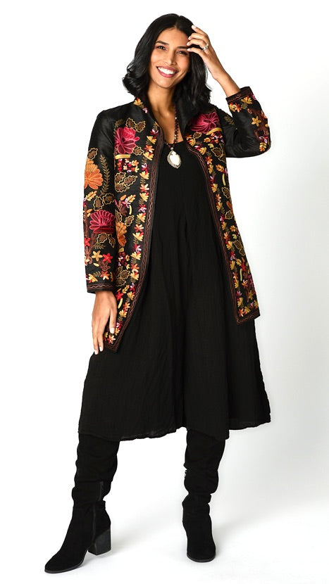 The Embroidered Silk Jacket is a breathtaking, heritage product that encompasses the skills and history of embroidery of generations. Wear it over our Easy Romper in travel rayon and you're set to go! Wearable art with a delicate beauty and heirloom potential.