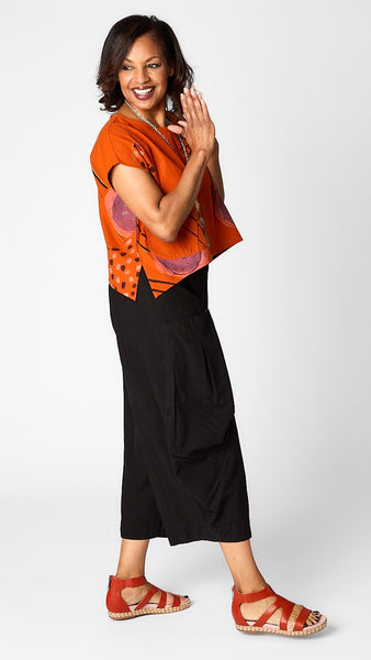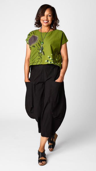 Liven up your season with art to wear from our newest collection. The Round Neck Topper uses a mix of modern and traditional techniques such as block printing, batik dyeing, and hand-stitched overlay detail, creating a fun, vibrant and thoughtful collection of wearable art. Shown here with the Double Pocket Pant from Gerties 11 Stitch in black. Complete the look with your favorite sandal for a kicky, fun look!